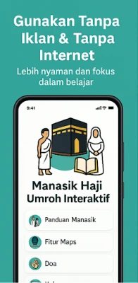✅ Simulasi Manasik Interaktif: Visualisasi gambar dan langkah-langkah manasik yang mudah diikuti.