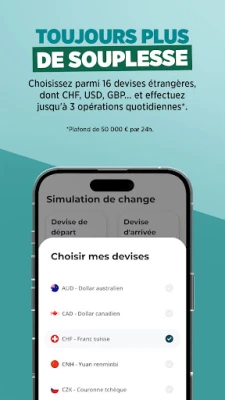 * Choisissez parmi 16 devises étrangères disponibles dont CHF (Franc suisse), USD (Dollar américain), GBP (Livre sterling)…