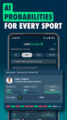 Oddschecker+ will show you the top plays based on expected value, where our AI projections have identified a mathematical edge over the sportsbooks’ odds.